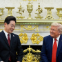도널드 트럼프(Donald Trump) 대통령이 2018년 3월 22일 워싱턴 D.C.에서 열린 제너레이션 넥스트(Generation Next) 백악관 포럼에서 진행자 찰리 커크(Charlie Kirk)와 악수하고 있다.